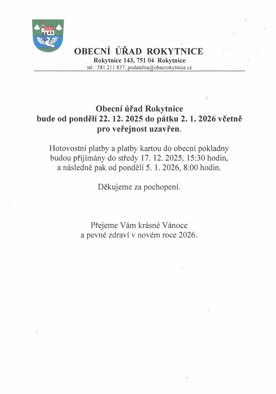 Česká pošta, s.p. informuje o krátkodobé uzavírce provozovny Rokytnice z provozních důvodů.